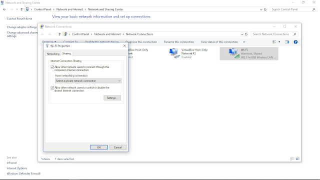 Dan pilih tab Sharing lalu centang 2 kotak tersebut dan pilih share ke Ad-hoc yang tadi kita buat